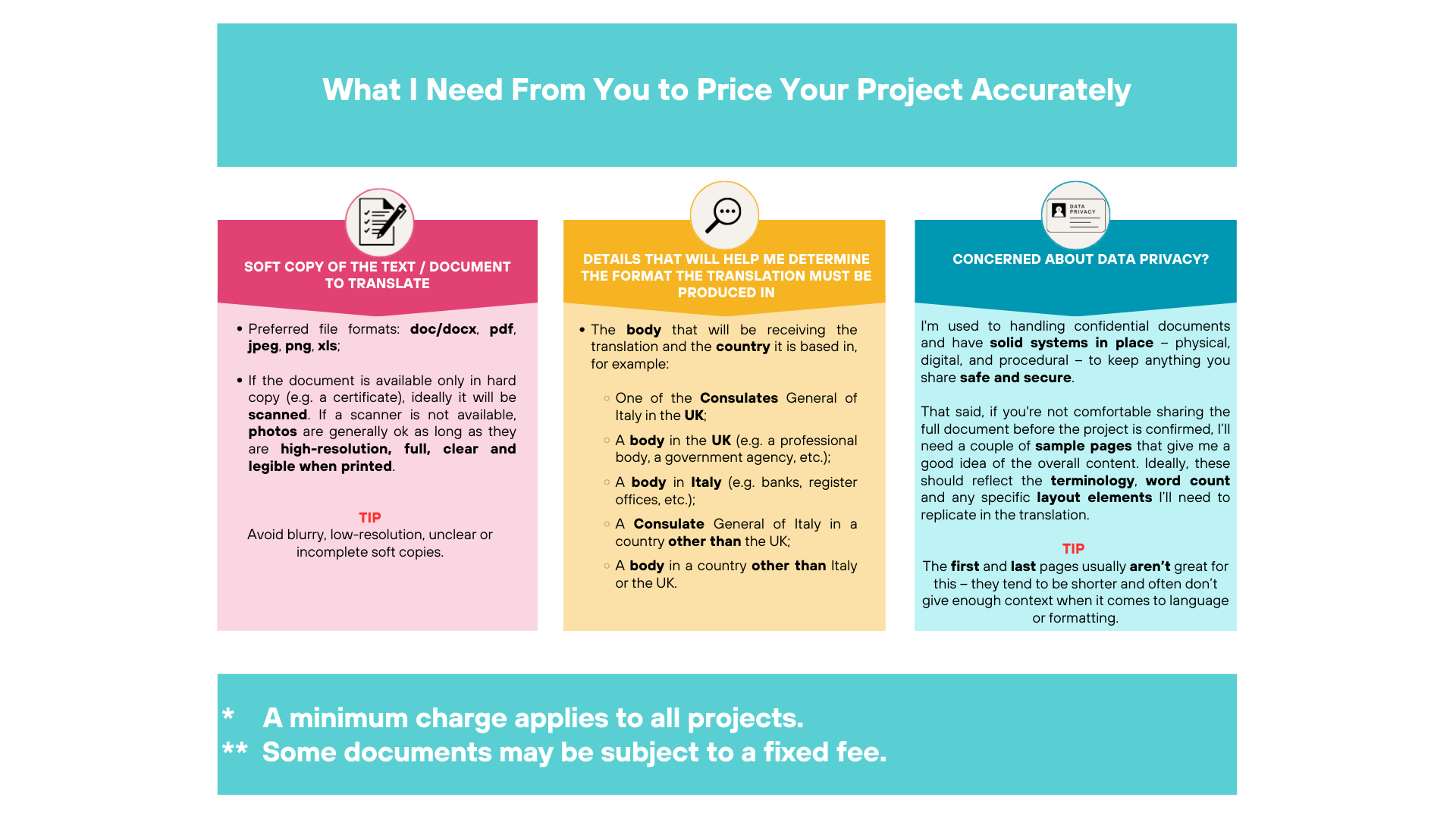 - Format β What format does the translation need to be in? This usually depends on where the document is going and whoβs receiving it (e.g. an official body in a specific country).